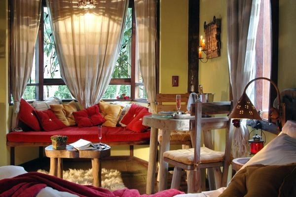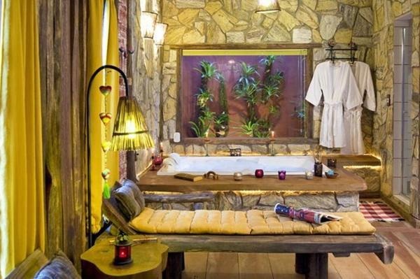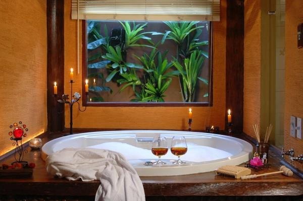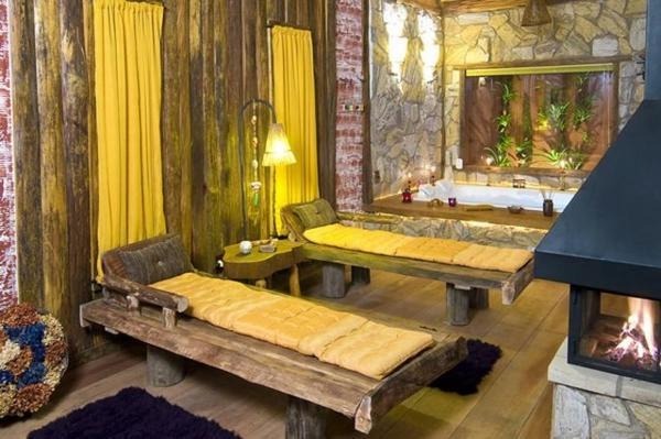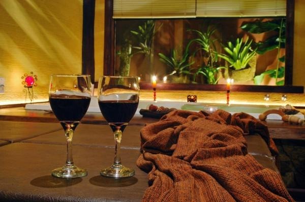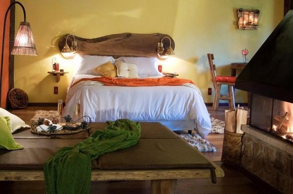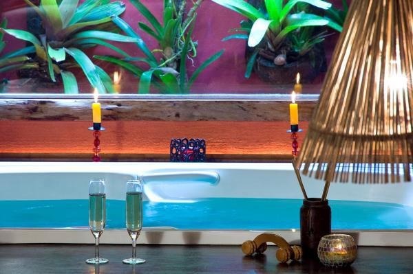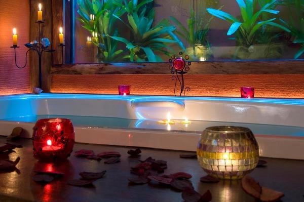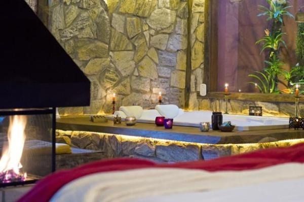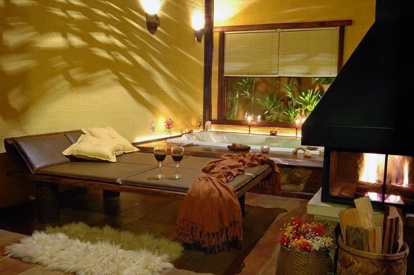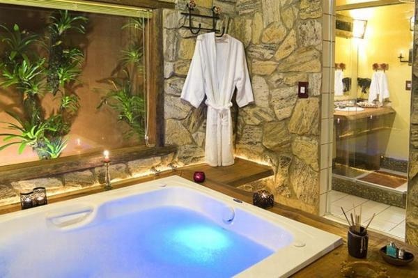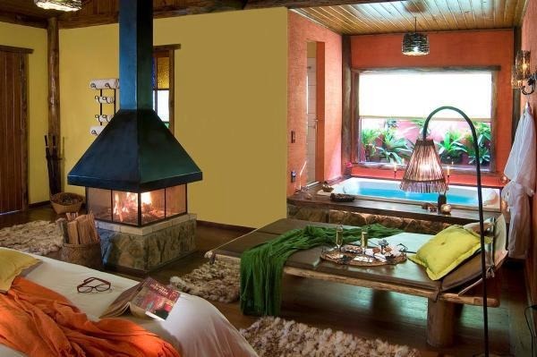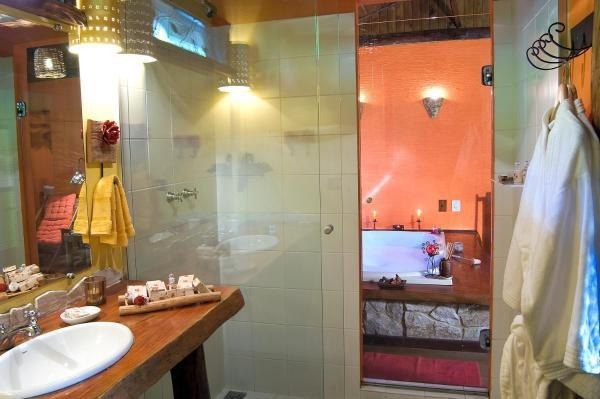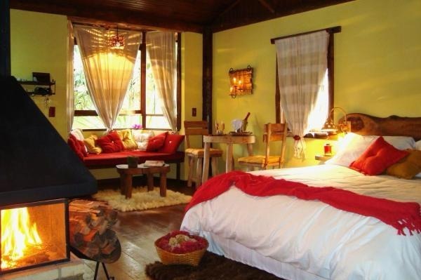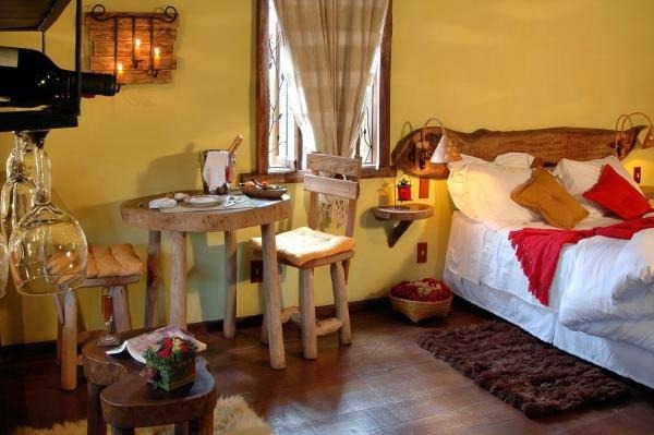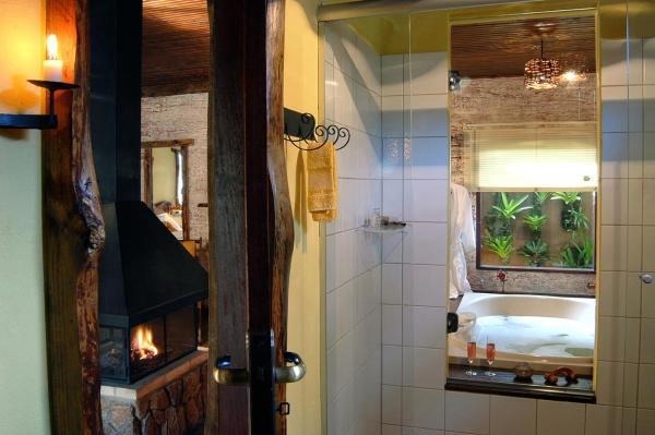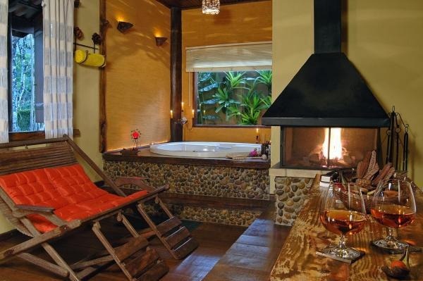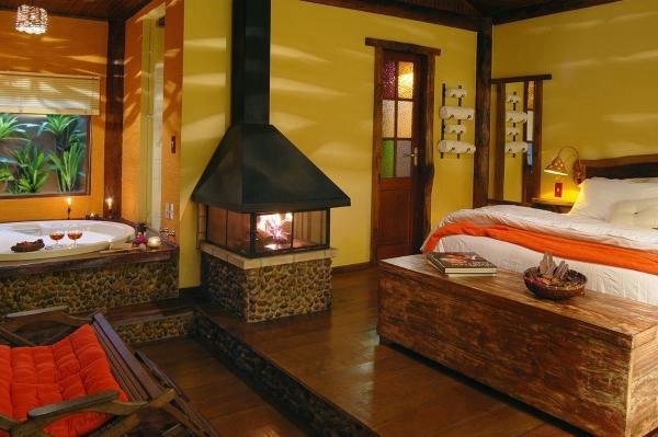 Chalé rústico, com Hidromassagem retangular Master e cromoterapia, TV LCD 22?/DVD, Dvdteca com mais de 300 filmes, Lareira com kit completo e reposição, Frigobar (taças e louças de apoio), Cama Queen (rouparia algodão 300 fios), Toalhas Kingsize, Espreguiçadeiras e Roupões, Kit amenities e Secador de cabelo, Guarda chuva, Lanterna e Varanda com rede.